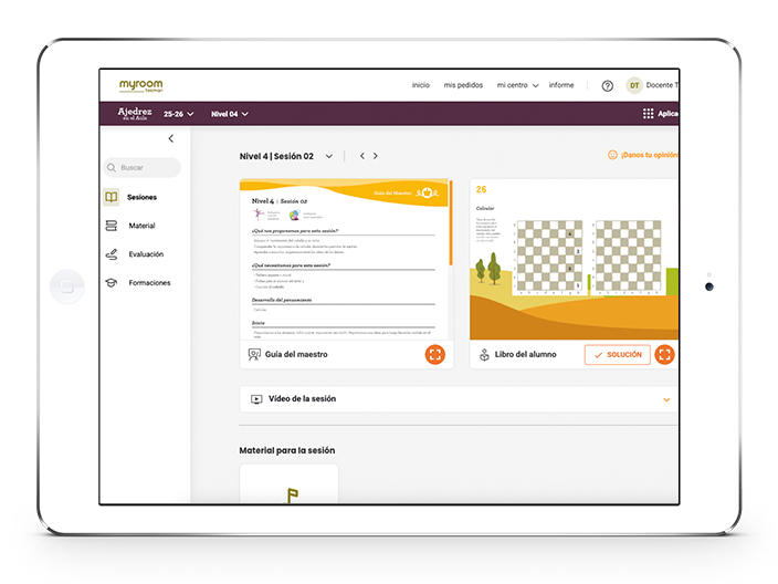 • myroom. Gestor de aula digital con materiales imprimibles como tableros de ajedrez, recursos y herramientas para planificar el curso, preparar sesiones, impartir clases, evaluar y formarte.