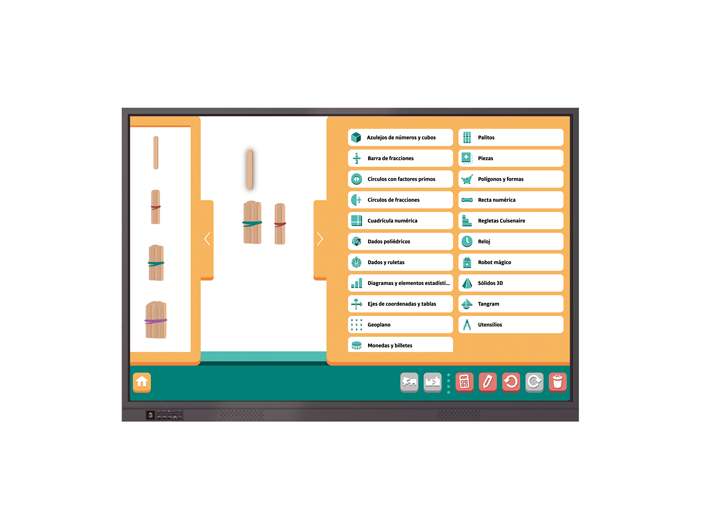 • Pizarra digital. Entorno manipulativo digital con diversas funcionalidades para hacer demostraciones de actividades en gran grupo.