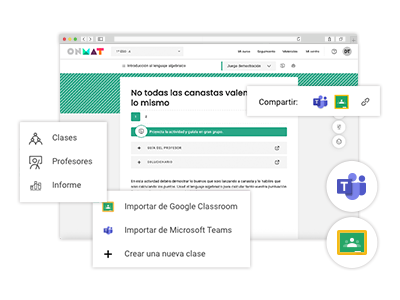 ONMAT se conecta con tus herramientas de gestión de aula. Puedes crear grupos desde la plataforma o importar tus clases directamente, compartir actividades personalizadas y exportar notas de los ejercicios autocorregibles.