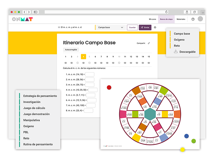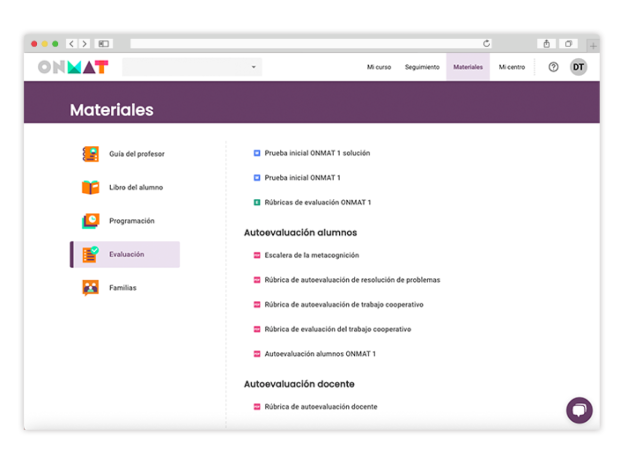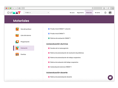 • Plataforma digital ONMAT. Contiene todos los ejercicios y recursos del programa, con ejercicios autocorregibles, recursos teóricos e instrumentos de evaluación.